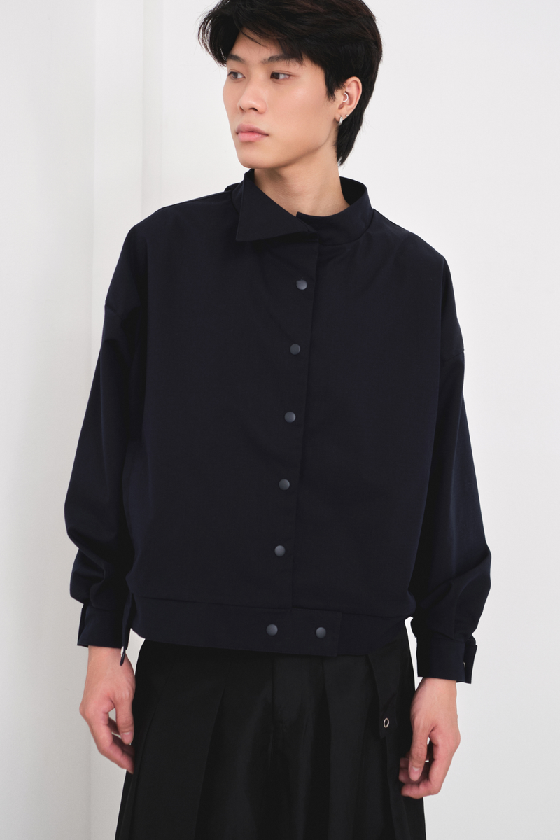 - Featuring an asymmetric collar detail and snap button closure along the front and cuffs.