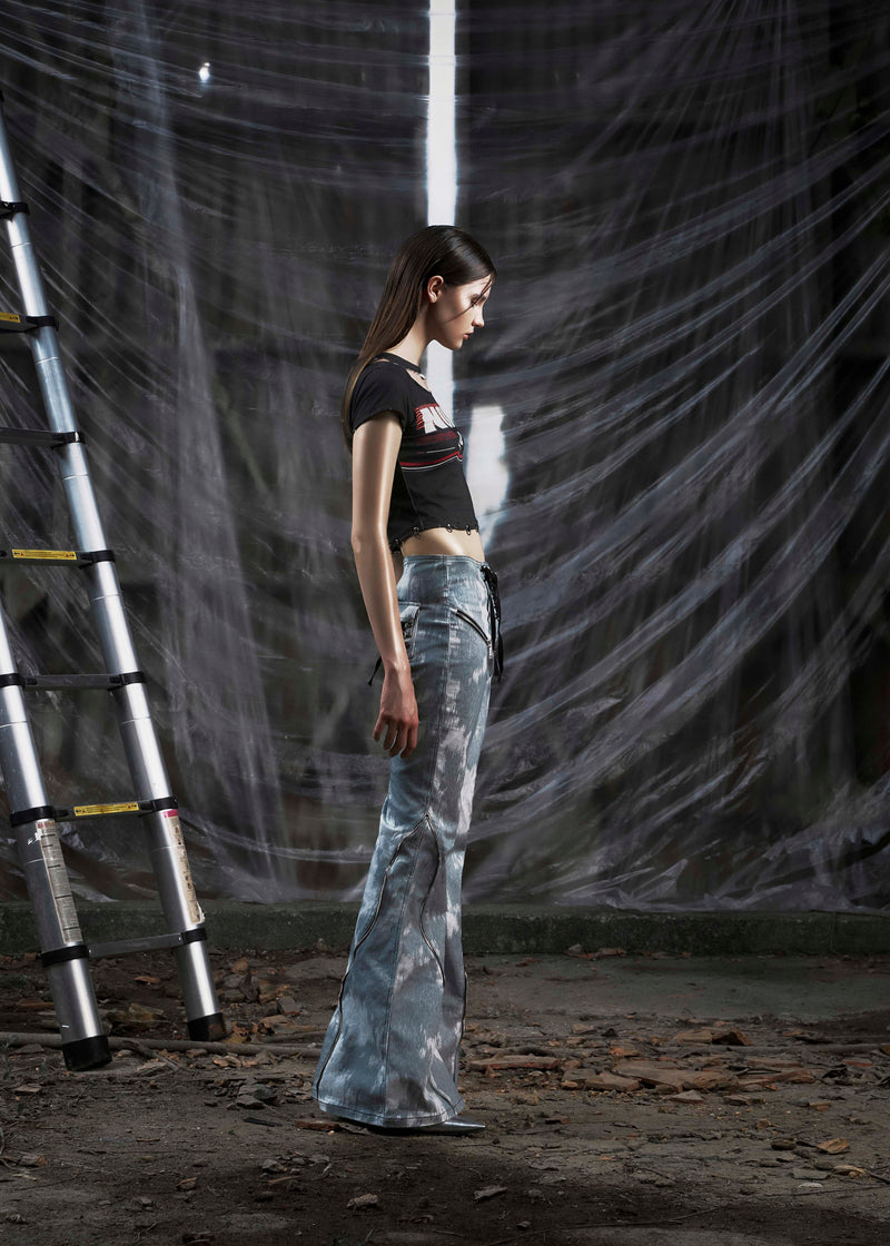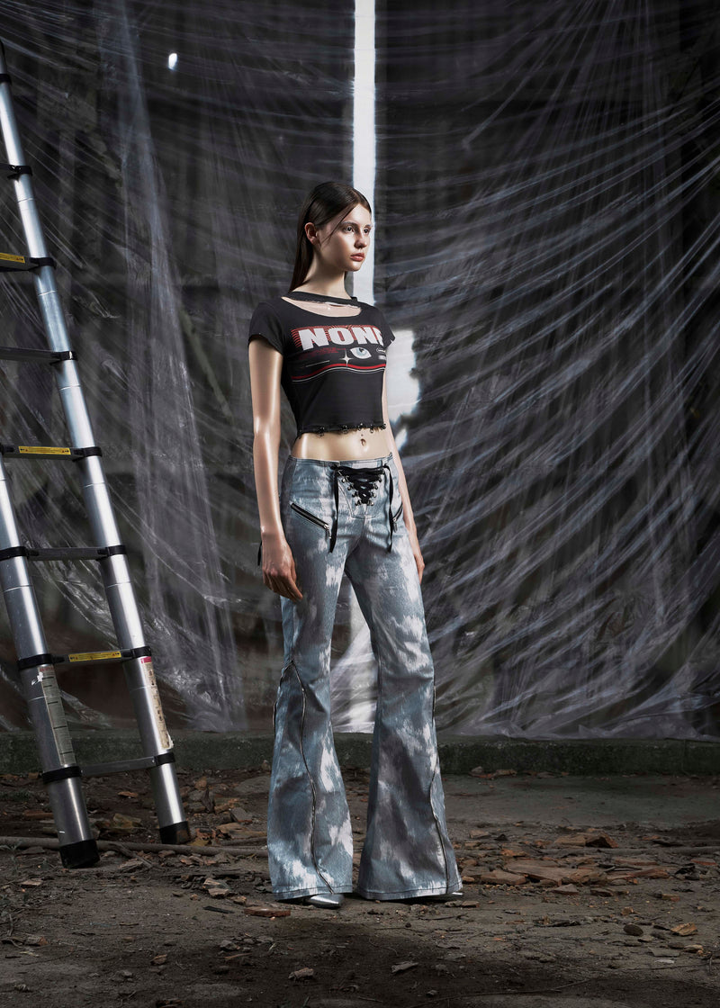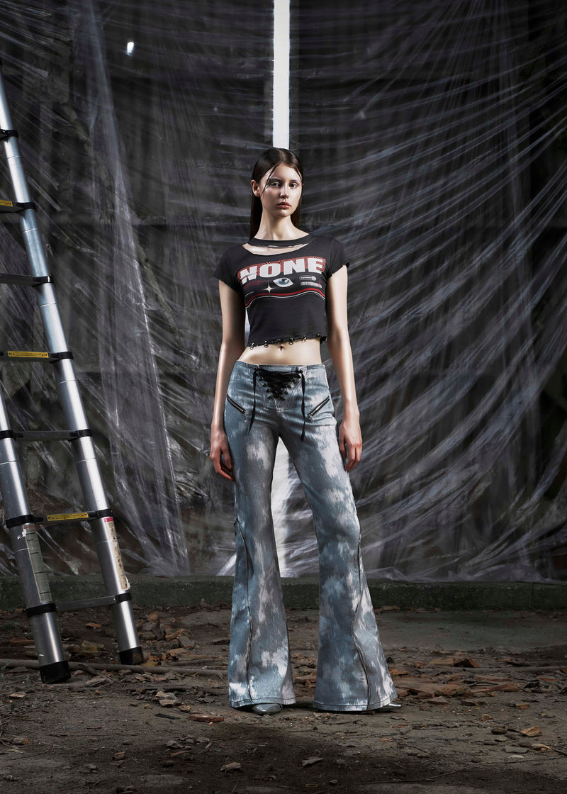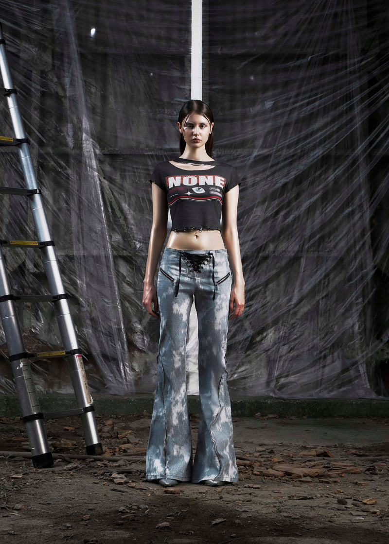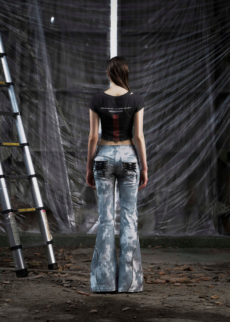- Detail: Full body printed pattern, front waistband with laces, two back pockets with laces, flared leg with flared zipper, zipper at the hips
