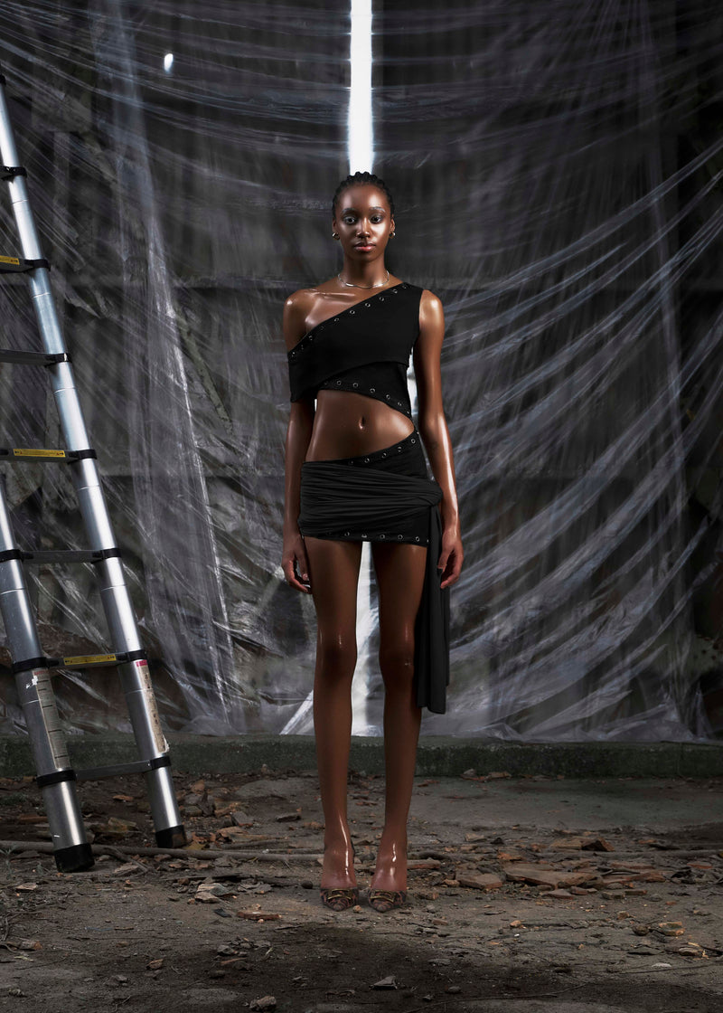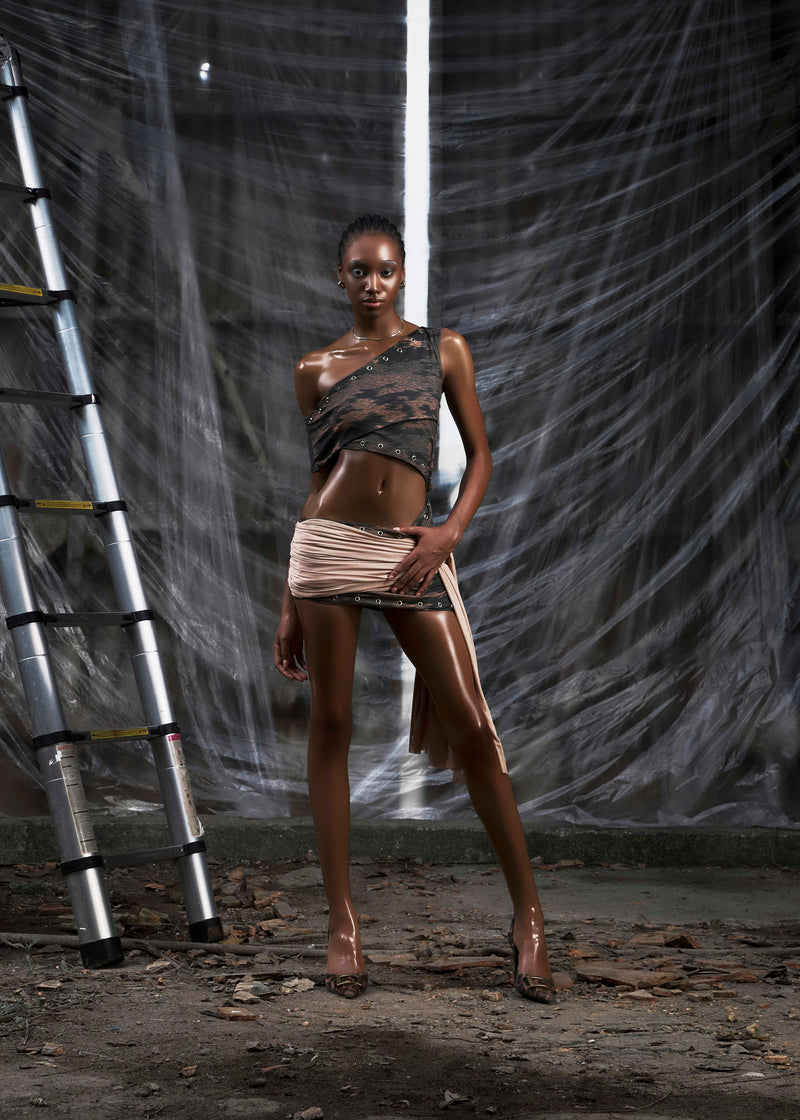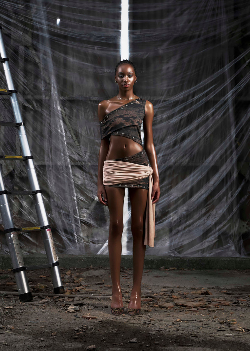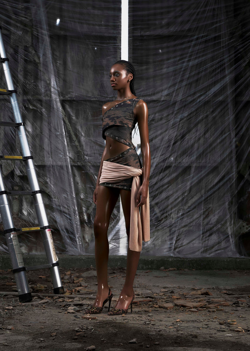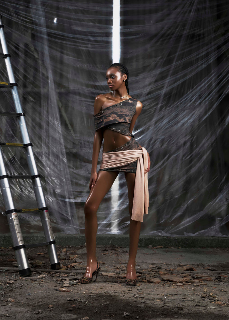 - Detail: Full body print, off-shoulder on right side, collar sewn with perforated hem along collar, short sleeve on left side, deep waist cut to create slim waist, skirt with mesh hem that can be tied in many ways, thigh length
