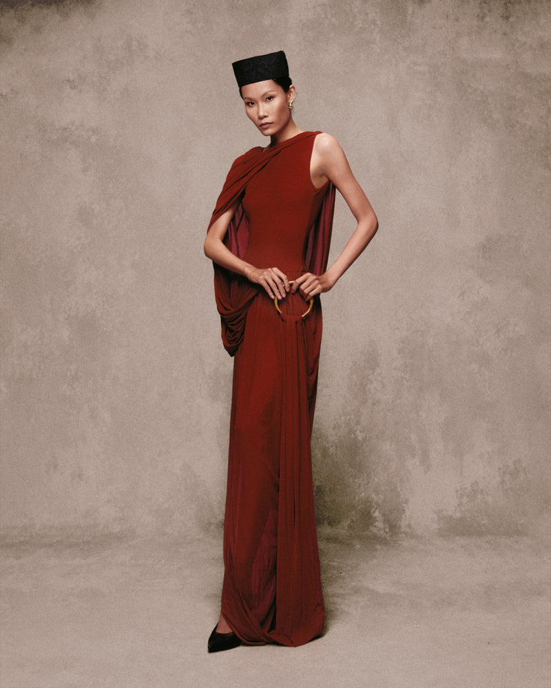 - Asymmetric, unconventional, and contemporary, this design features meticulously draped folds set in a vibrant red, creating a striking visual impact.
