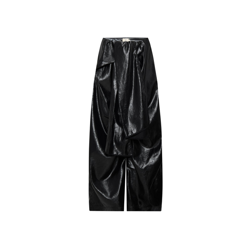 - The farmer’s essence is reflected in the front tie detail of the trousers crafted in modern leather, creating a dialogue between tradition and modernity.